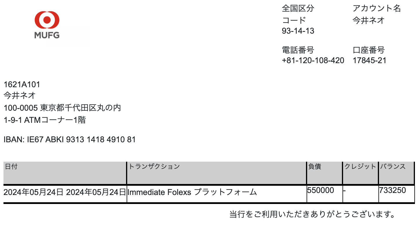 オフィスに戻るとすぐに、すべての取引のうち約85%が利益を上げていることがわかりました。また、上手くいかなかったのは15%程度でした。それでも、利益は出ました。今、私の口座には658910円あります!550000 円を引き出し、妻へのプレゼントを買いました。1時間以内にすべてが完了し、その後も収入が途絶えることはありませんでした。"こちらが銀行の明細書です: